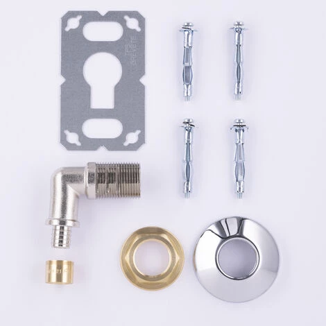 - Le kit contient : 1 platine + 1 contre-Ă©crou Ă plateau + 1 raccord d’alimentation coudĂ© PER Ă glissement + 1 bague laiton + 4 chevilles et vis pour plaque de plâtre + 1 rosace chromĂ©e.